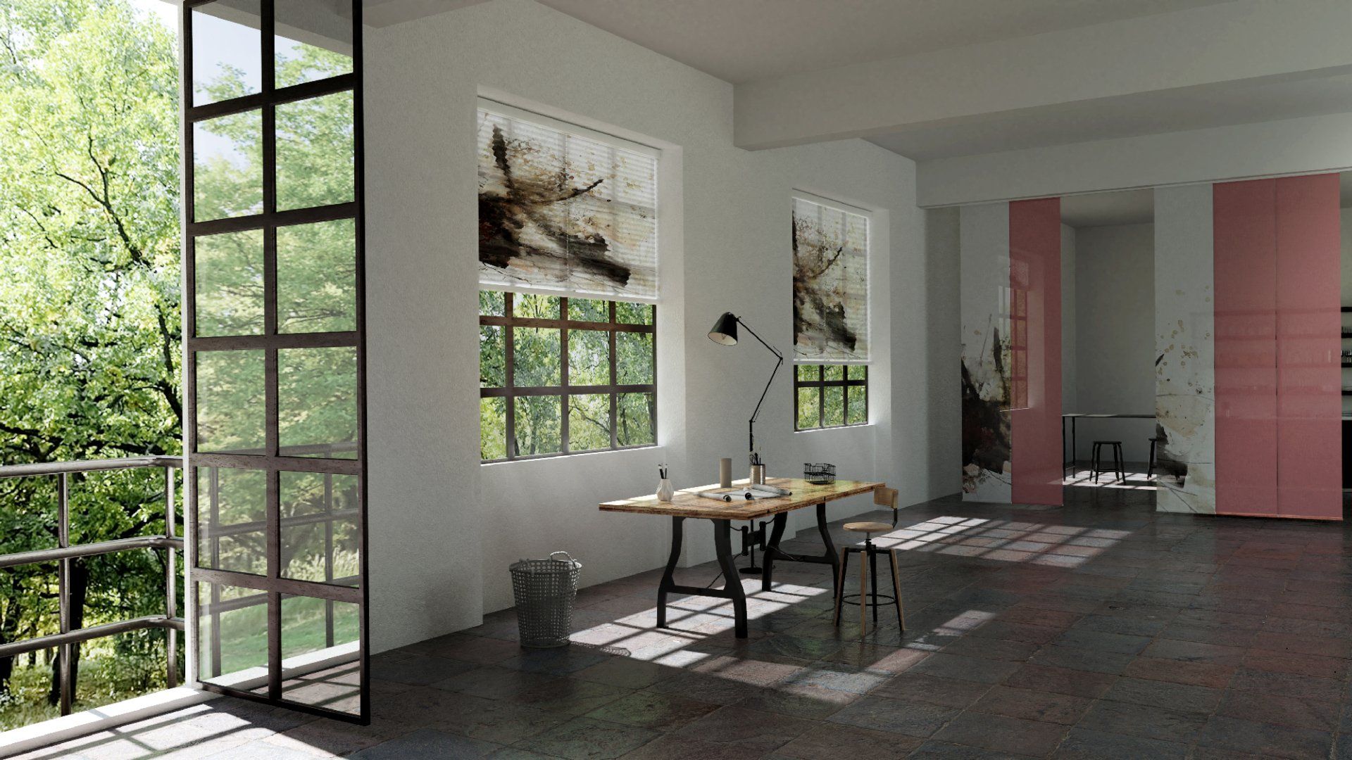 Ein Rollo besteht aus einer Aluminium- oder Stahlwelle und einem darauf aufgewickelten Stoffbehang. Die Sicht- und Lichtmodulation entsteht durch das Auf- und Abwickeln des Behangs, der sich in feinsten Stufen arretieren lässt.